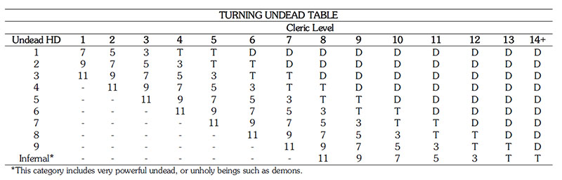 Clerics can invoke the power of their deity to repel undead monsters encountered. To turn the undead, the player rolls 2d6. The referee then consults the table opposite, comparing the roll against the Hit Dice of the undead monsters targeted. Successful Turning If the turning attempt succeeds, the player must roll 2d6 again to determine the number of HD affected (turned or destroyed). Turned undead: Will leave the area, if possible, and will not harm or make contact with the cleric. Destroyed undead (result of D): Are instantly and permanently annihilated. Excess: Rolled Hit Dice that are not sufficient to affect a creature are wasted. However, at least one undead creature will always be affected on a successful turning. Mixed groups: If turn undead is used against a mixed group of undead monsters of different types, those with the lowest HD are affected first.